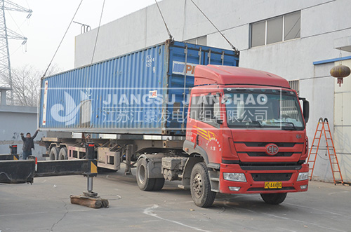 工人正在用鏟車將包裝好的發(fā)電機(jī)組裝入集裝箱中